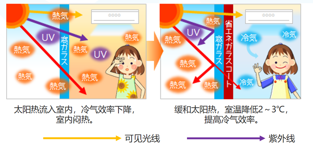 夏天---能阻隔太阳光中的红外线,可降低室温3~7 ℃,相当于将空调设定温度调高3~7 ℃ ,通常每月可降低耗电64.8kWh左右,节约电费68.03元/月左右。